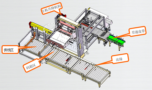 尼為碼垛機系列被用于食品飲料、化工等行業(yè)等;適用于各種紙箱、塑箱、膜包及桶類等多種類型包裝件的堆疊,設備主機分為差速皮帶、 轉向機構、排箱區(qū)、碼箱區(qū)、主體升降機構、出垛滾筒等部分組成。