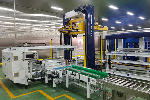 ③ 自動完成進(jìn)箱、轉(zhuǎn)箱、分排、成堆、移堆、提堆、進(jìn)托、下堆、出垛等步驟;